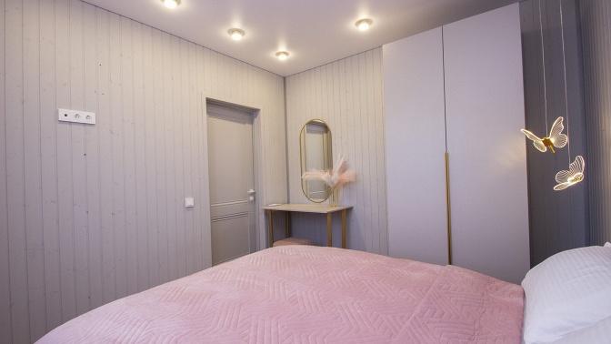 — спальня: двуспальная кровать, вместительный шкаф, тумба, туалетный столик с зеркалом, пуф, кондиционер, постельные принадлежности для 4 человек;