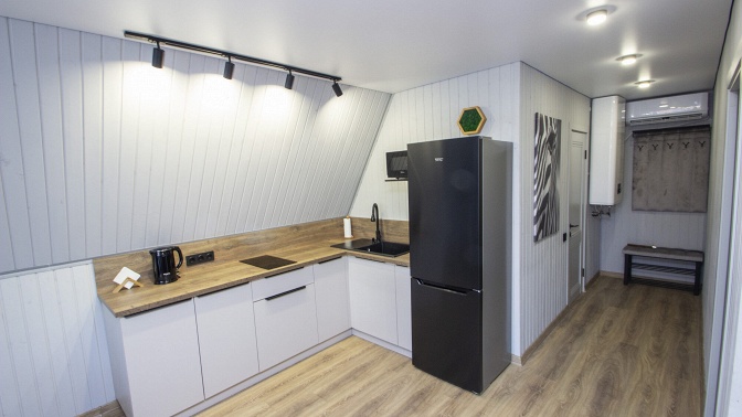 — кухня-гостиная: кухонный гарнитур, комплекты столовой посуды, приборов, посуды для приготовления еды, большой раскладной диван, стол, 10 стульев, телевизор, кондиционер, холодильник, чайник, электроплита, микроволновка, утюг и гладильная доска (по требованию), вешалка с обувницей;