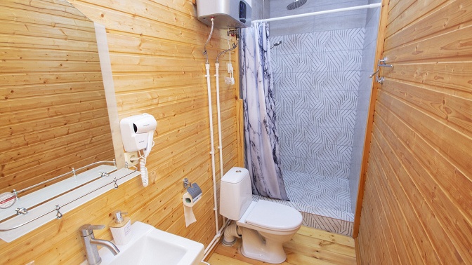 — фен, зубные наборы, жидкое мыло, шампунь, гель для душа, душевая кабина, унитаз, раковина, зеркало;