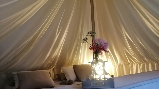 — романтичный полотняный шатер с огромной двуспальной кроватью, интересным декором и стильной подсветкой;