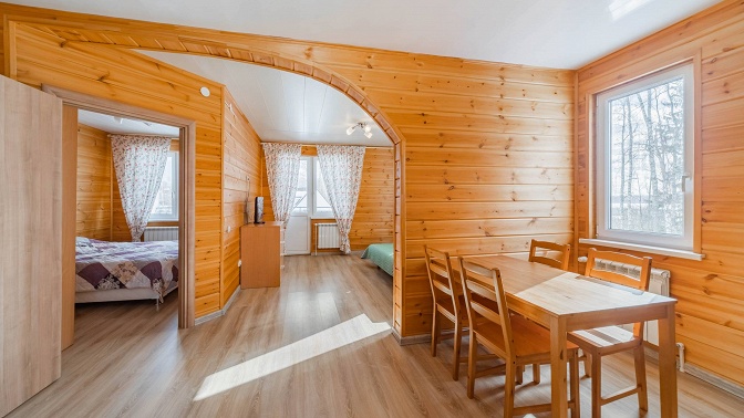 Номерной фонд представлен 60 просторными апартаментами разных категорий комфортности и изолированными коттеджами. Просторные номера с деревянной отделкой стен отличаются эргономичностью, чистотой и домашней атмосферой. Все апартаменты и дома оснащены широкими и мягкими кроватями, кухнями, укомплектованными электрическими плитами, микроволновыми печами, холодильниками и столовой посудой, телевизорами, собственными ванными комнатами, доступом к Wi-Fi. - https://dom-korabl.ru/