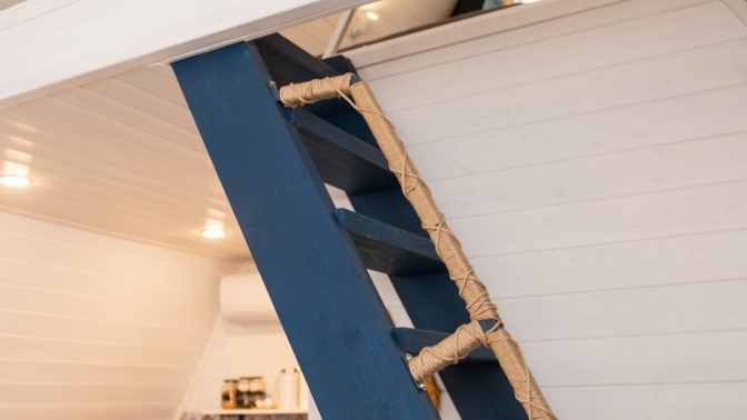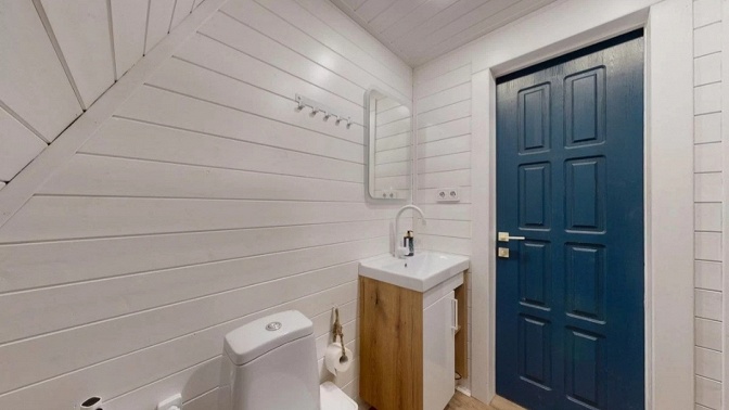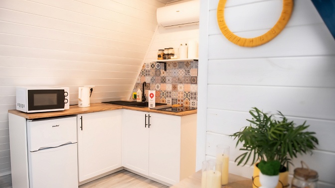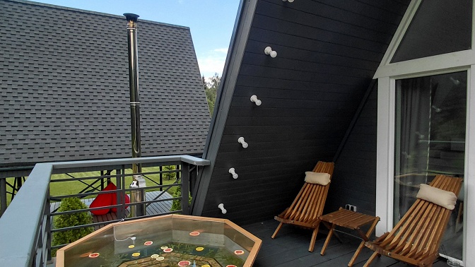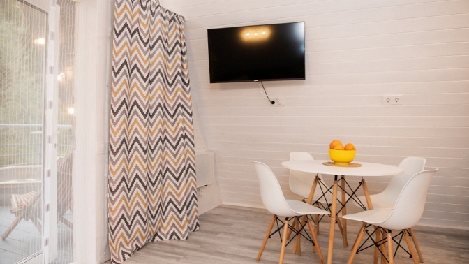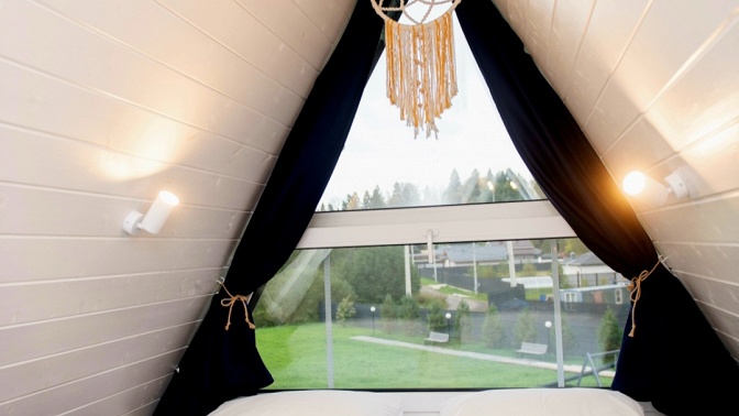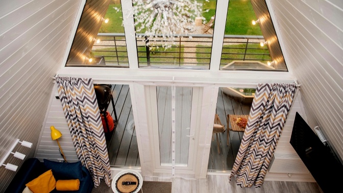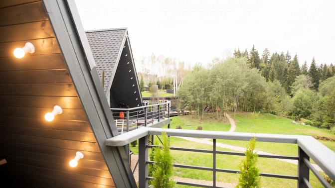 А-фрейм дома с террасой подняты над землей на 2,5 метра. Внутри созданы все условия для комфортабельного размещения. Здесь есть кухня и гостиная, а на втором этаже — зона отдыха с панорамным окном. Рядом — закрытая парковка, индивидуальная костровая зона и выход к реке.