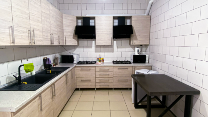 — кухня самообслуживания со всем необходимым для комфортного отдыха (микроволновая печь, холодильник, плита и посуда).