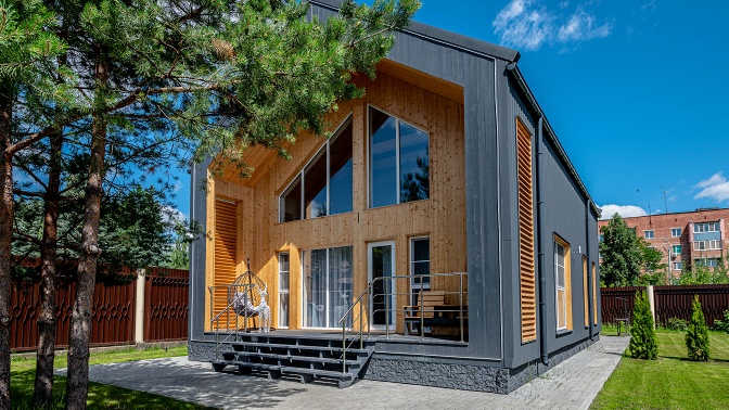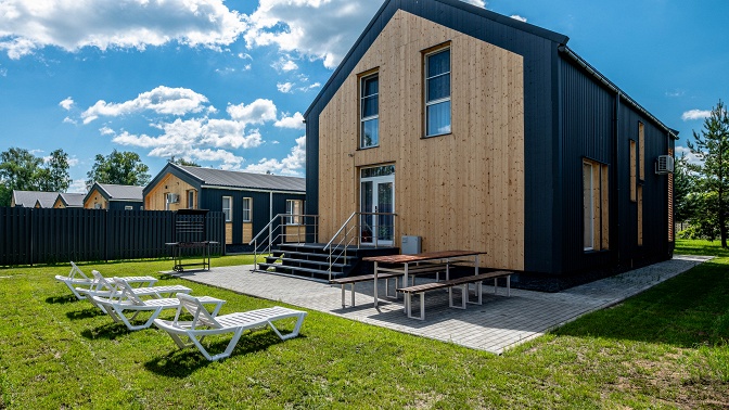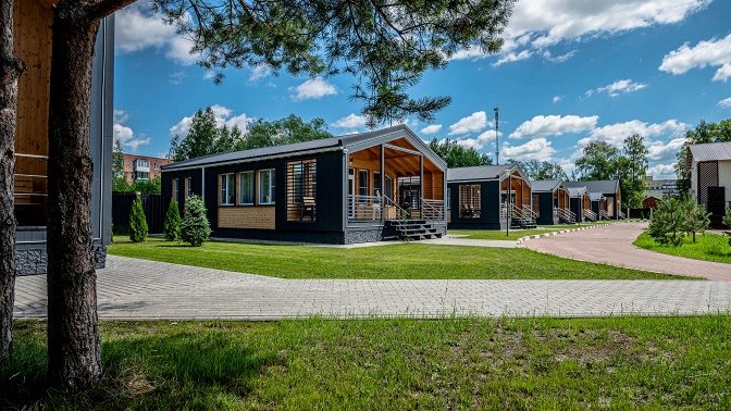 «Модуль-Дом» в стиле барнхаус с панорамными окнами отличается современным дизайном. Здесь кухня-гостиная с раскладным диваном и 2 спальни. «А-фрейм» — треугольный дом площадью 35 кв. м. Здесь также 2 спальни и кухня-гостиная.