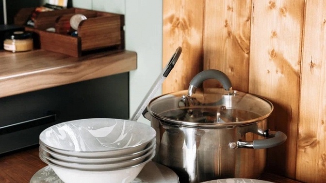 — кухонная зона (стол, чистящие средства, индукционная плита, кухонные принадлежности, электрический чайник, микроволновая печь, холодильник);