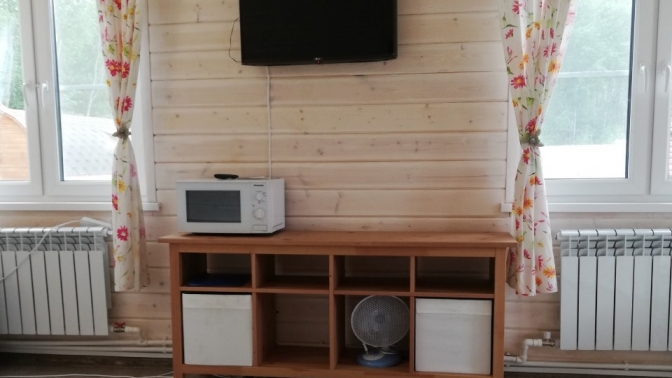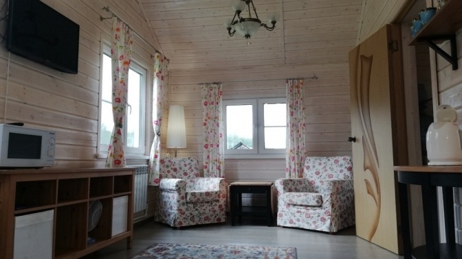 — гостевая комната с большим диваном, 2 креслами, столиком, микроволновой печью и посудой;