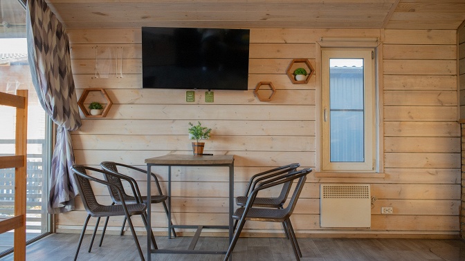— техника: телевизор со Smart TV, Wi-Fi, фен, микроволновая печь, умная колонка, плита для приготовления пищи, система безопасности, утюг, часы-будильник, стиральная машина;