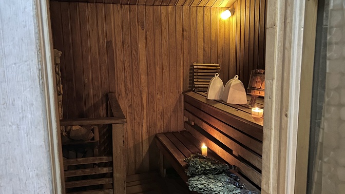 — ванная комната: душ, сауна, раковина, гостиничная парфюмерия, душевая кабина, унитаз, банные полотенца, мыло, туалетные средства, зеркало;