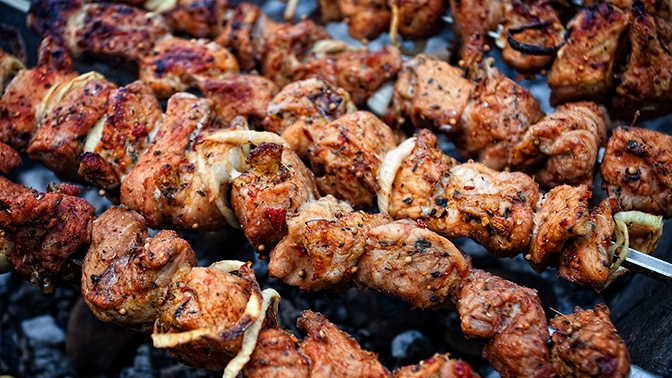Чтобы мясо хорошо прожарилось, его режут небольшими кусочками, которые после нанизывания на шампур впитывают характерный аромат дымка. За шашлыком нужно постоянно следить. Чтобы он не подгорел, угли часто и понемногу сбрызгивают соленой водой. Ароматный, сочный шашлык можно дополнить свежими овощами или любым другим гарниром!