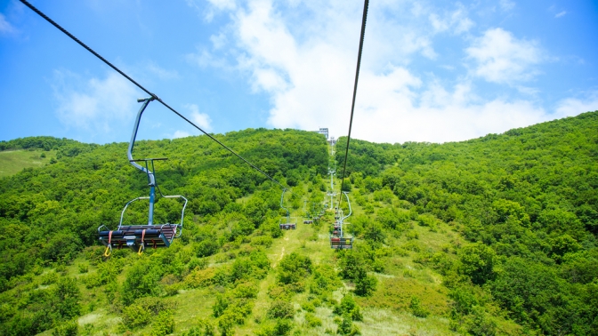 — желающие могут воспользоваться канатной дорогой (допплата) (работает по погодным условиям), которая приведет к нижней части парка, где расположился небольшой зоопарк, пруд, аттракционы;