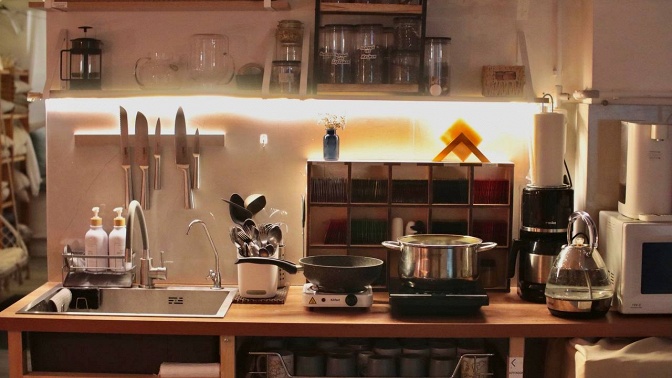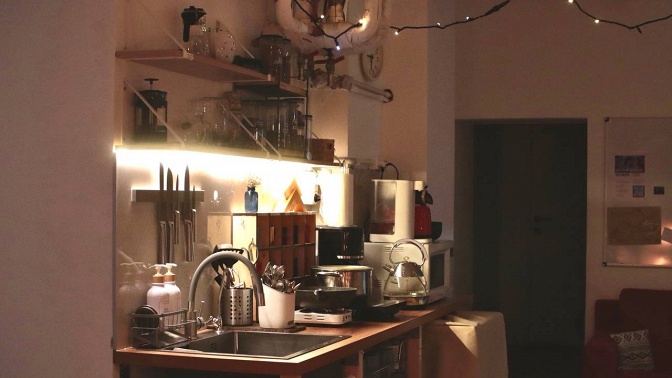 — много мягкой мебели, плита, духовка, холодильник, душ, канцелярия;