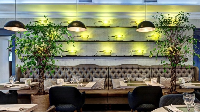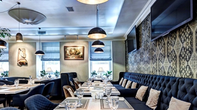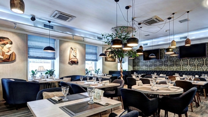 Особого упоминания заслуживает интерьер. Светло-серые стены, одна из которых украшена мозаичным орнаментом, серо-голубые римские шторы, кожаные и велюровые кресла, глубокие диваны — особенности зала. Стены украшены барельефами, где изображены грузинки. В этой обстановке легко настроиться на приятный отдых и забыть про все проблемы.