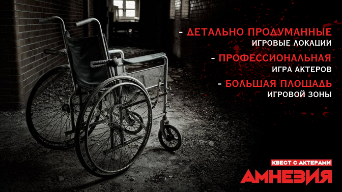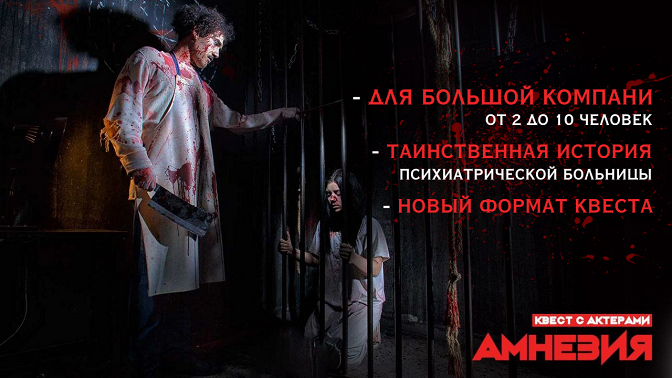 — Скидка 70% на участие в квесте «Амнезия» с актерами для компании от 2 до 4 человек (пн-чт) (1800 руб. вместо 6000 руб.)