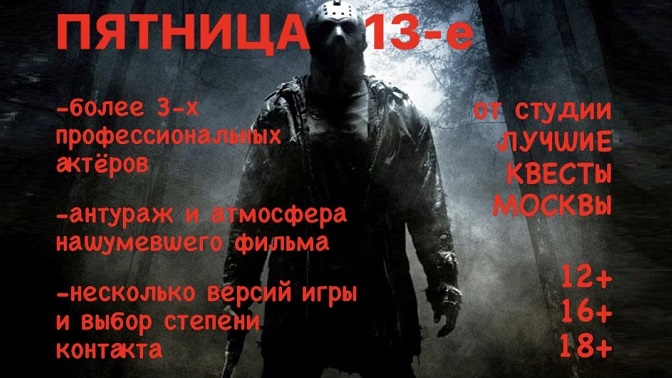 — Скидка 65% на участие в квесте «Пятница 13-е» (пт-вс: с 16:30 до 03:30) (2975 руб. вместо 8500 руб.)