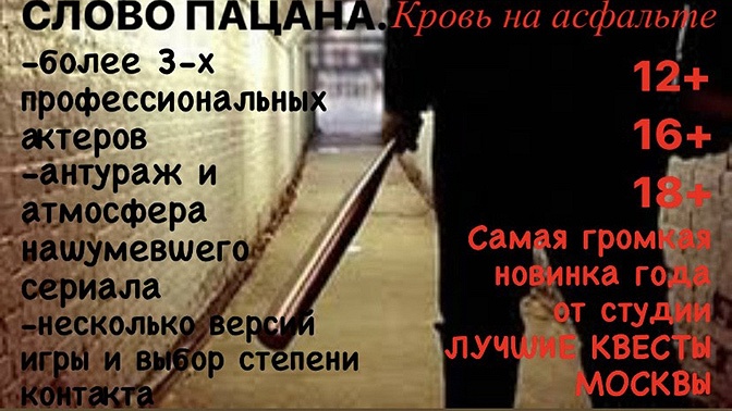 — Скидка 65% на участие в квесте «Слово пацана. Кровь на асфальте» (пт-вс: с 16:30 до 03:30) (2975 руб. вместо 8500 руб.)