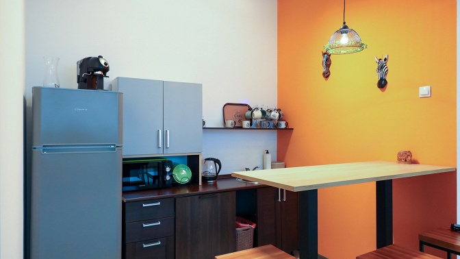 Еще предусмотрены постоянные фотозоны для детей и для их родителей, также возможно оформление фотозоны специально для виновника торжества. Для максимального удобства есть уютная кухня с холодильником, микроволновкой и другой техникой.