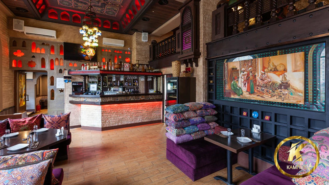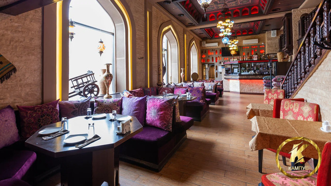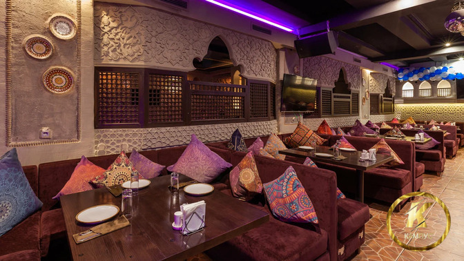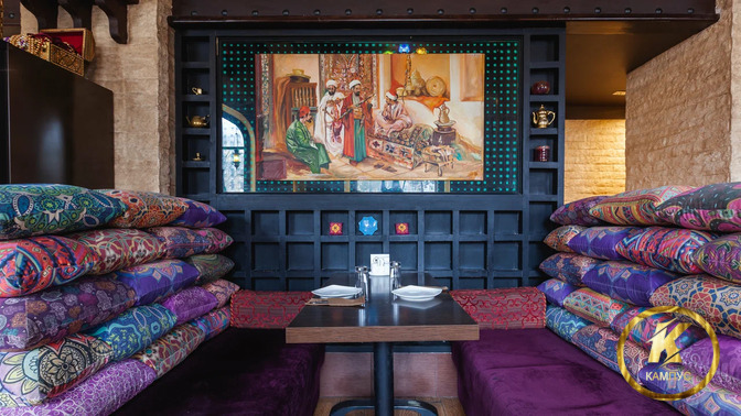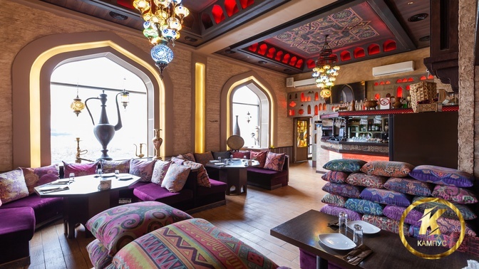В интерьере преобладают пастельные, фиолетовые и шоколадные оттенки. Ресторан оформлен в восточном стиле. Пестрые подушки и элементы декора с орнаментом передают особый колорит заведения. Обстановка располагает к неспешному времяпрепровождению.