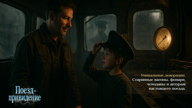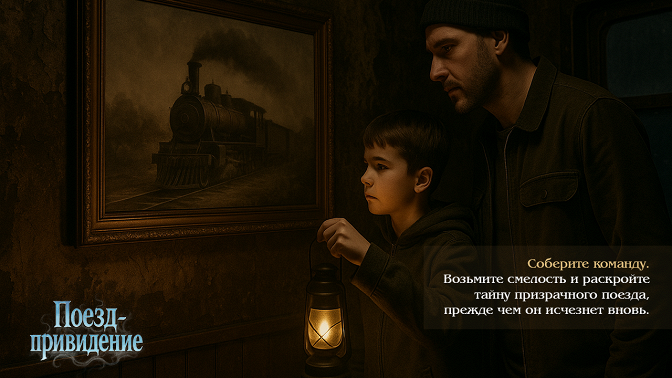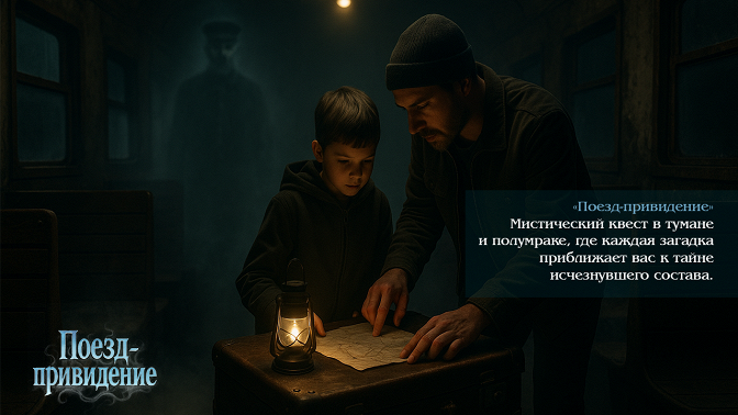 - «Поезд-привидение» — это мистическое приключение, где реальность переплетается с легендой. Вам предстоит попасть в атмосферу старого вокзала и встретиться с загадочным составом, который появляется лишь в тумане. Внутри вагонов скрываются тайны прошлого, зашифрованные подсказки и испытания, способные бросить вызов даже самым смелым.