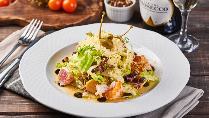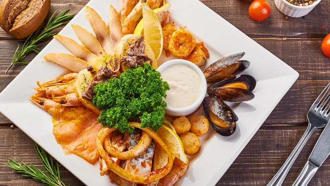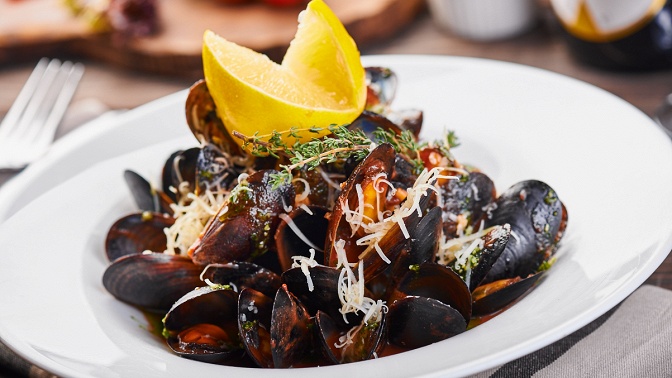 В меню собрали лучшие блюда из разных кухонь мира. На закуску готовят антипасти с артишоками, хрустящие баклажаны со страчателлой и халуми жареный с брусникой. Также подают морепродукты, к примеру, есть мидии и устрицы, гребешки, лангустины и морские ежи. Среди основных блюд — тайский суп, стейки, бургеры и паста, а на десерт предлагают попробовать медовик и чизкейк. В ресторане 2 зала, где играет живая музыка.