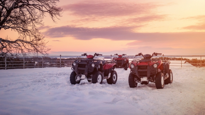 Четырехколесные квадроциклы устойчивы, удобны в управлении и маневренны. Эти машины способны пройти по трассам, на которых вы не прокатитесь на легковом автомобиле или спортивном мотоцикле. При управлении квадроциклом важно правильно перемещать вес таким образом, чтобы добиться сцепления всех колес с поверхностью дороги. Не стоит также совершать резкие повороты на большой скорости, а при заносе следует повернуть руль в сторону заноса. При спуске с возвышенности перенесите вес тела на заднюю часть мотовездехода и немного убавьте скорость.