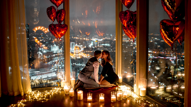 — аренда пространства на 67-м, 55-м или 51-м этаже «Москва-Сити», украшенного свечами и воздушными шарами (помещение полностью изолировано);