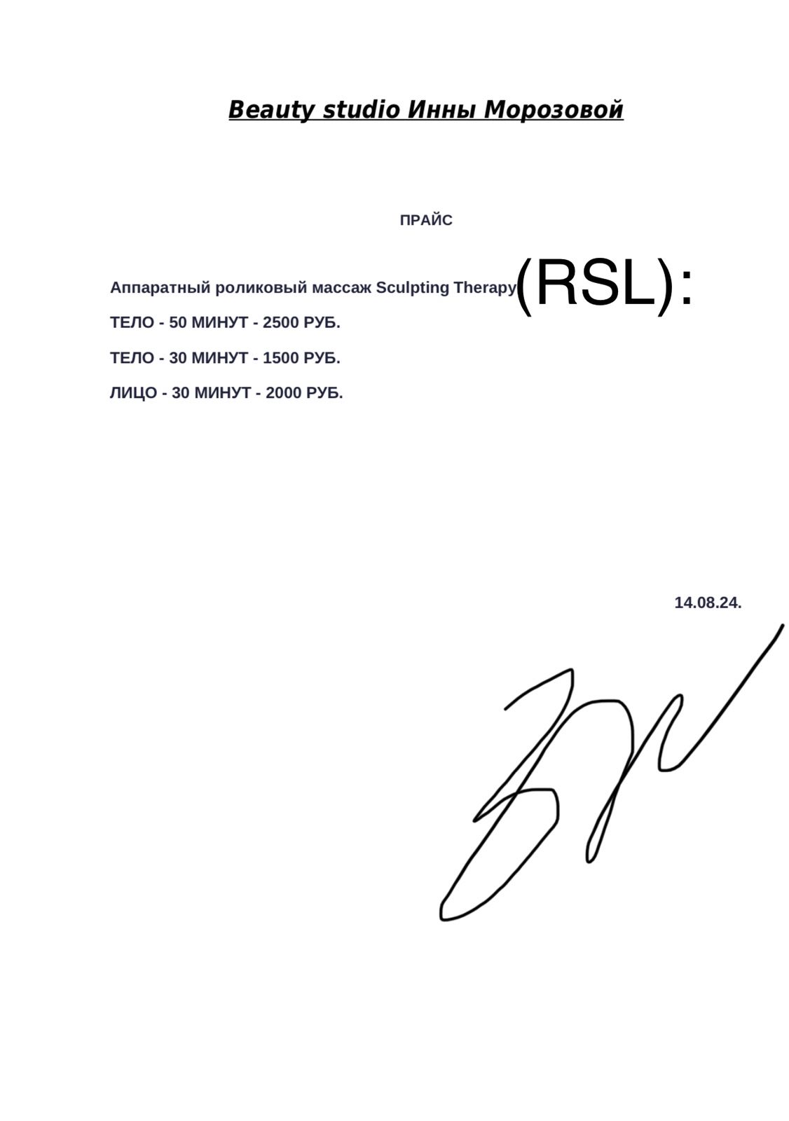 — каждое посещение массажа RSL-Sculpting Therapy — 1600 руб. за один сеанс по телу (50 минут);
