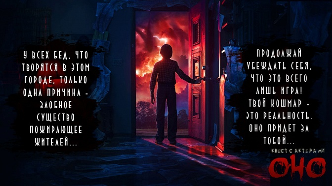 — Скидка 50% на участие в хоррор-квесте «ОНО: Добро пожаловать в Дерри» с актерами для компании от 2 до 4 человек (пн-чт) (2500 руб. вместо 5000 руб.)