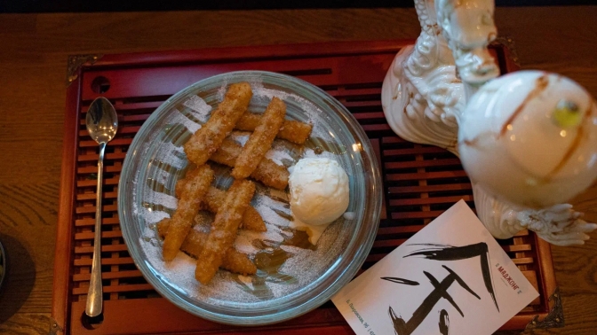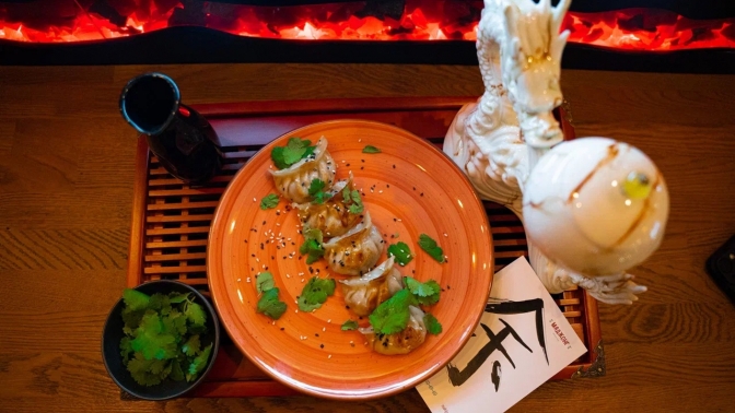 — корейские пельмени с телятиной и тофу (жареные, в порции 4 шт.);