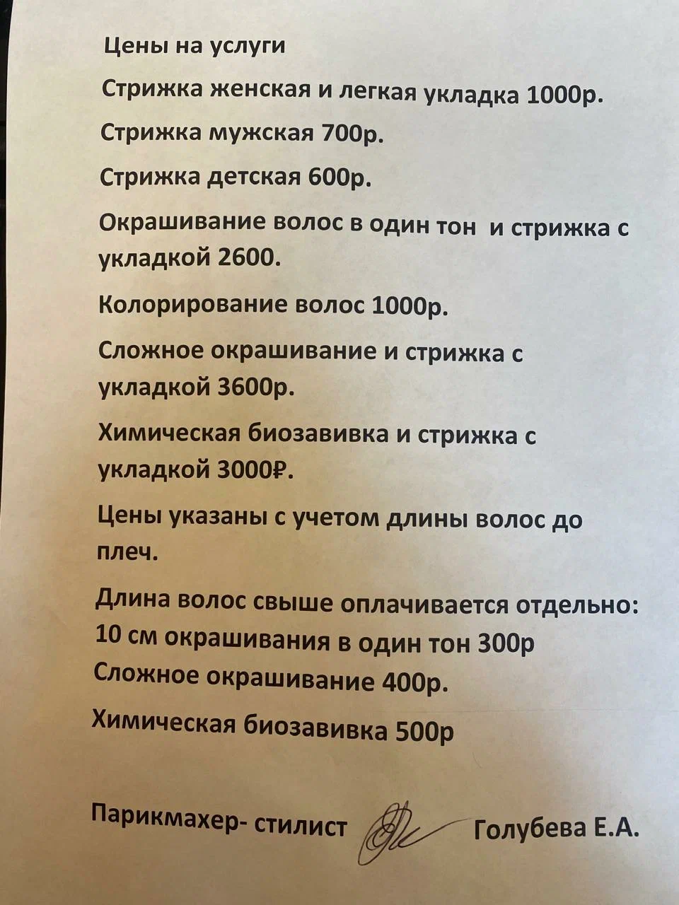 — услуги оказывает мастер Голубева Елена Алексеевна;