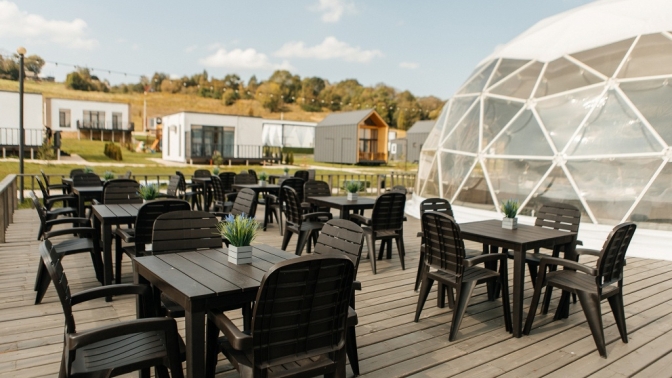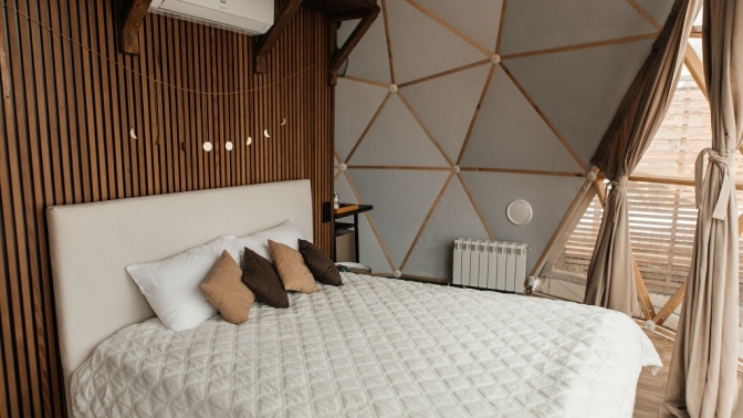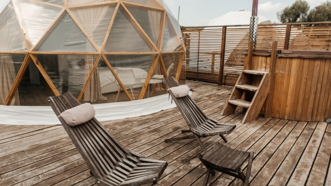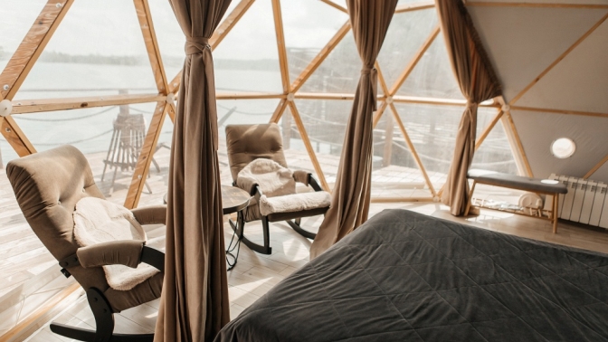 Для размещения предусмотрены домики и сферы с купелями на подиумах. Каждый вариант подразумевает детально продуманное оснащение. Тут есть все для комфортабельного проживания — удобная мебель, качественный текстиль, постельные принадлежности, посуда.