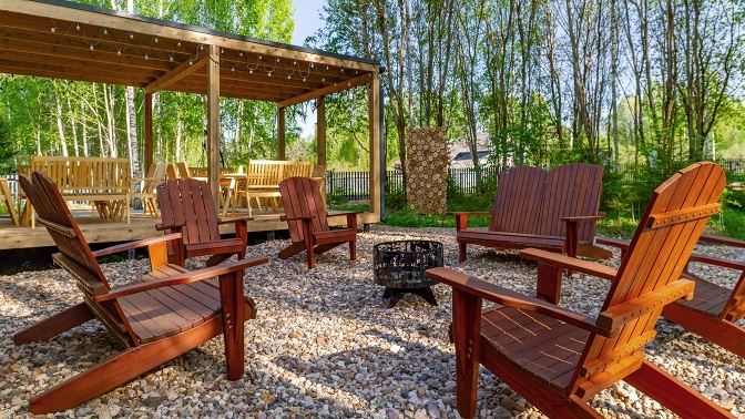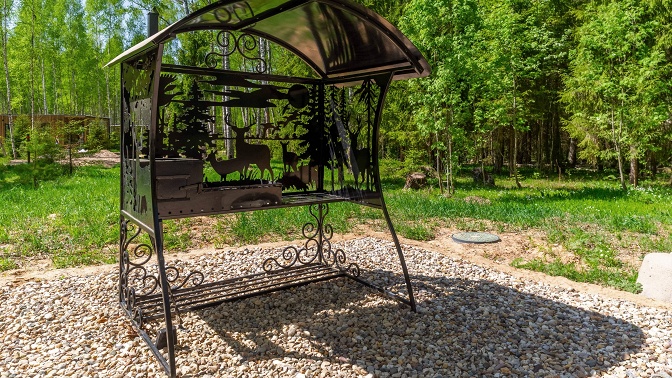 — большой мангал рядом с домом и уличная мебель, решетки, шампуры;