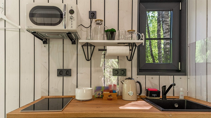 — полностью оснащенная кухня: плита, микроволновка, холодильник, чайник, наборы посуды, кастрюли, сковородки;