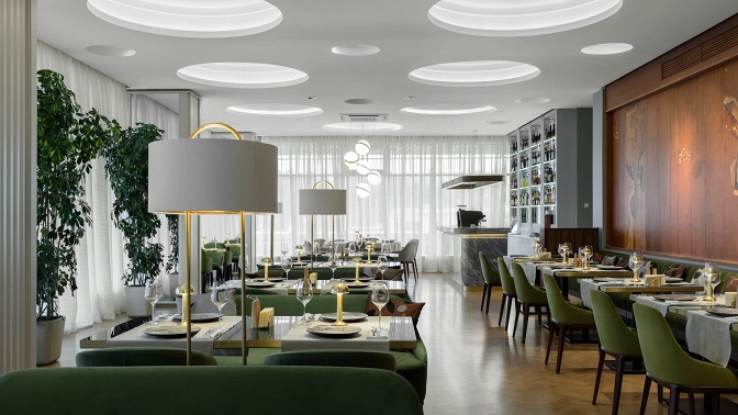 В главном ресторане гостиницы ежедневно подаются блюда в формате «шведский стол». Широкий ассортимент салатов, горячих блюд из мяса и рыбы, сезонных овощей и фруктов, десерты и выпечка порадуют самых требовательных гостей. Также в гостинице есть несколько тематических ресторанов, среди которых — ресторан итальянской кухни, ресторан грузинской кухни, кафе «Шоколадница» и лобби-бар. Гости также могут воспользоваться круглосуточной доставкой еды и напитков в номер.