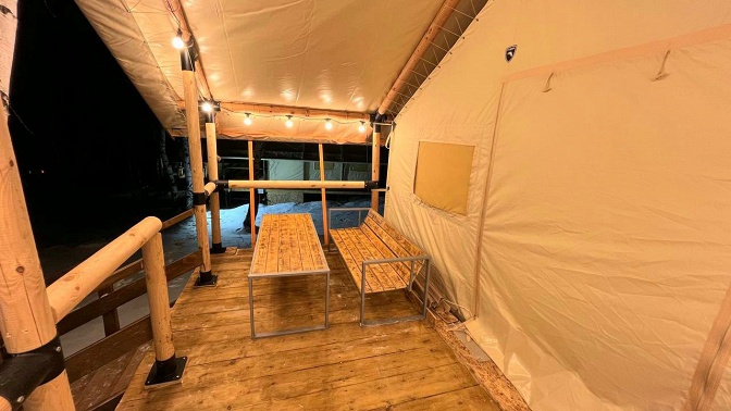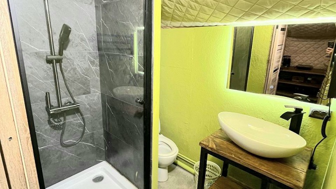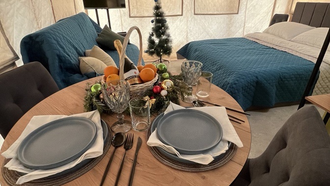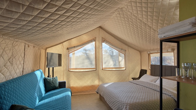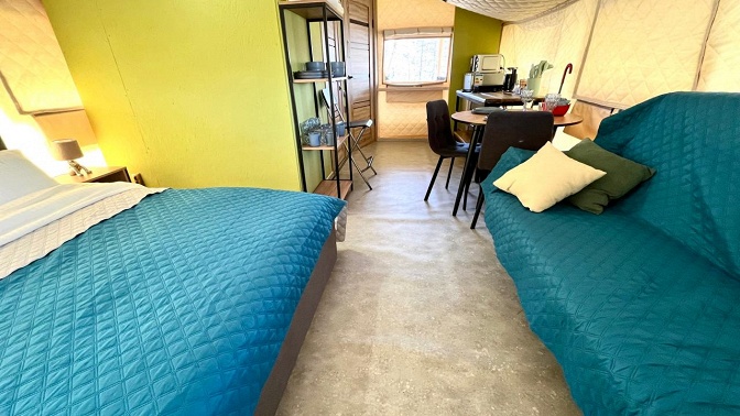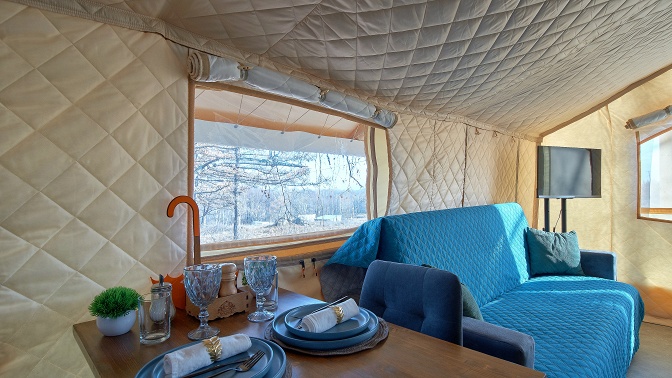 На территории есть сафари-хаус — это уютный отдельно стоящий домик площадью 24 кв. м с санузлом, отоплением, террасой и мангальной зоной для комфортного пребывания гостей до 4 человек. Номер снабжен всем необходимым.
