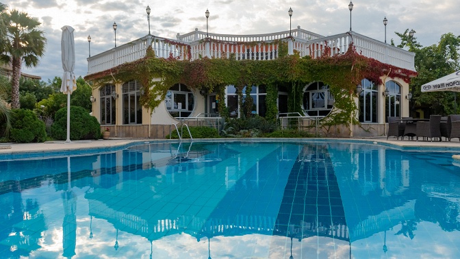— подогреваемый бассейн (9×18 м) с шезлонгами;
