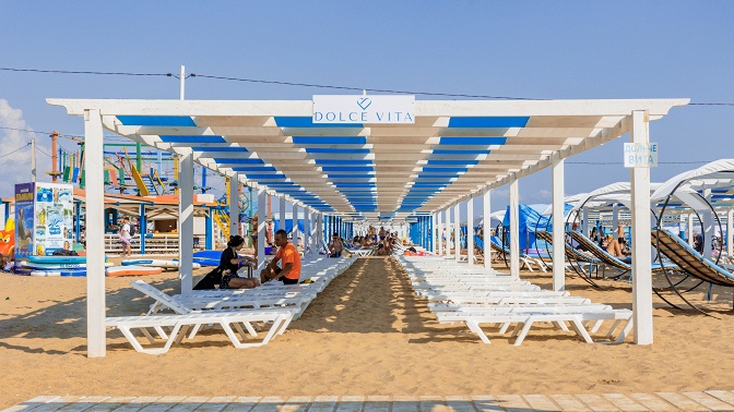 — собственный оборудованный пляж с шезлонгами и навесами в самом центре Витязево (с июля);