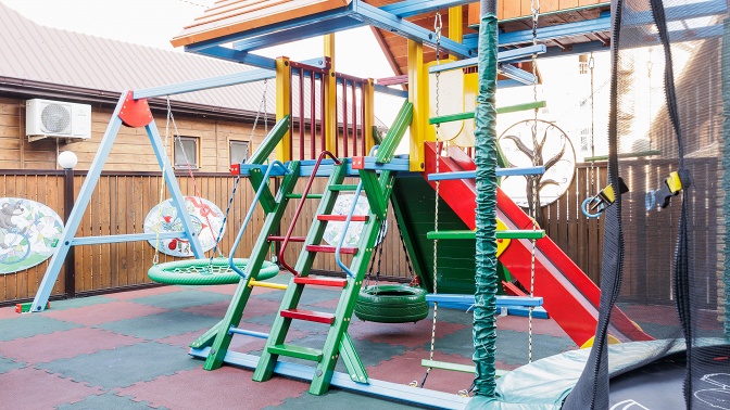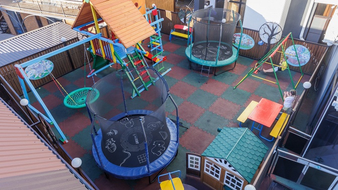 — большая детская площадка (100 кв. м) с двухэтажным детским городком, домиками, качелями, батутами, горками;