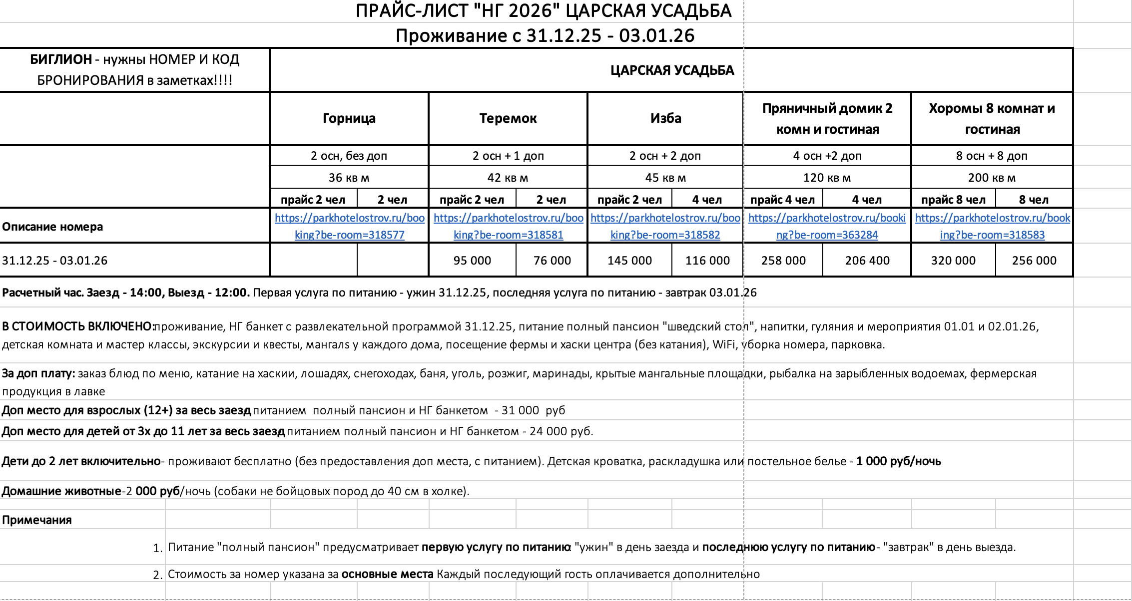 — трехразовое питание по системе «шведский стол»: ужины, завтраки и обеды (первая услуга по питанию — ужин (31.12.2025), последняя — завтрак (03.01.2026));