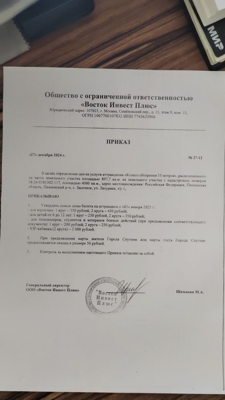 — Скидка 50% на 2 взрослых и 1 детский билет на посещение аттракциона «Колесо обозрения» (один круг) (30 руб. + доплата 445 руб. вместо 950 руб.)