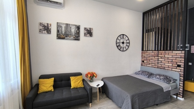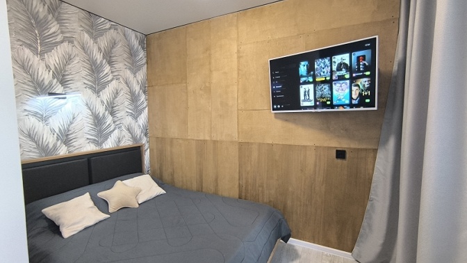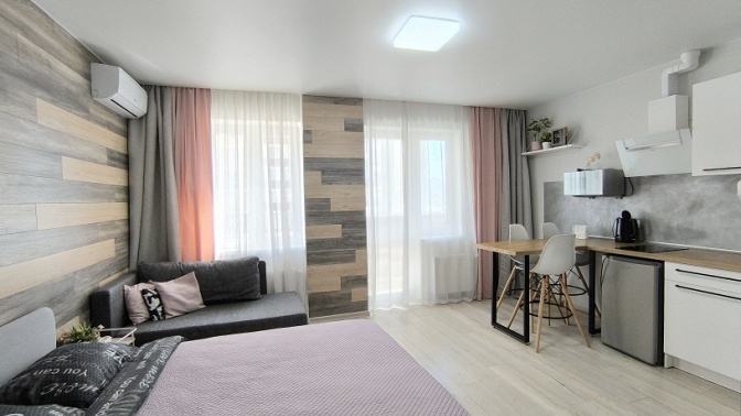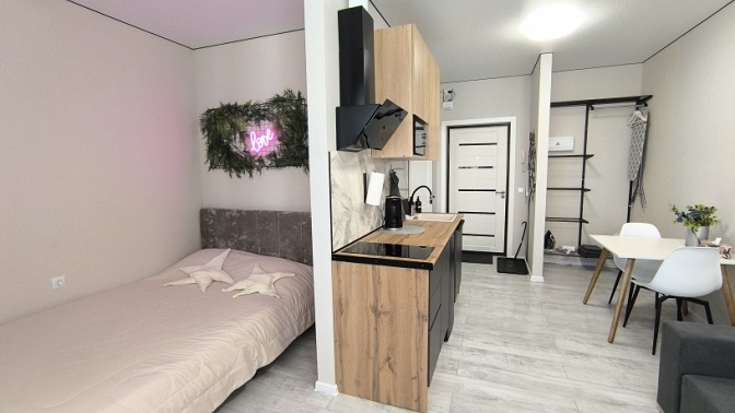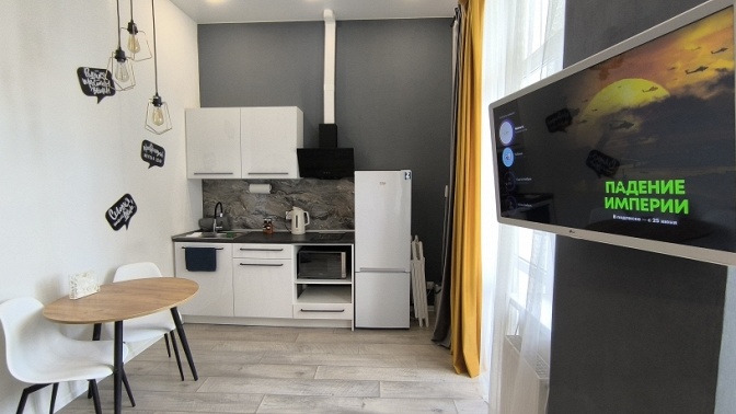 Апартаменты с современным дизайном интерьера оснащены мебелью для сна и хранения вещей, умной колонкой со встроенным голосовым помощником «Алиса», телевизором с функцией Smart TV, сплит-системой, утюгом, феном, ванной комнатой с полотенцами и предметами личной гигиены, кухней с плитой, стиральной машиной, мини-холодильником, электрочайником, микроволновой печью, бесплатным доступом к Wi-Fi.