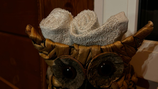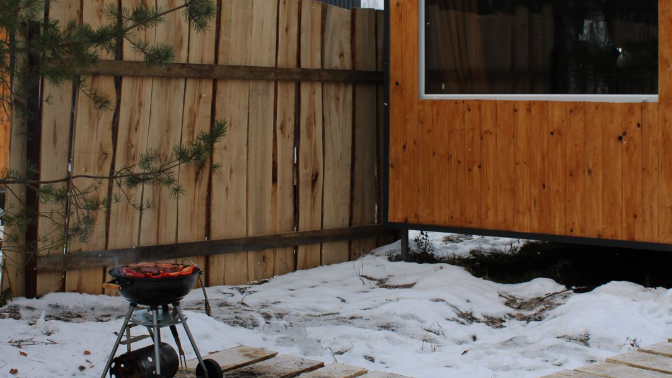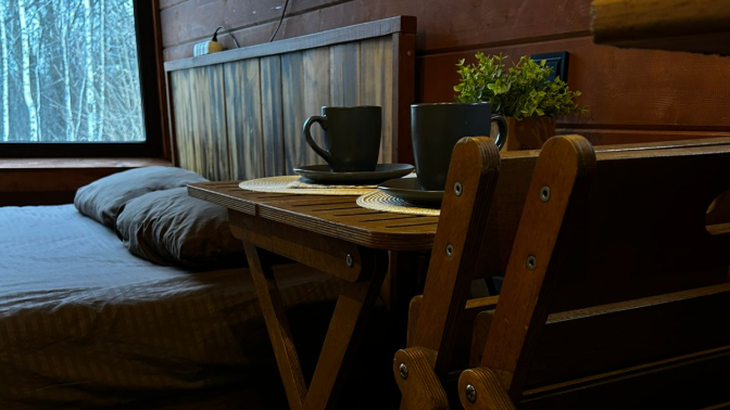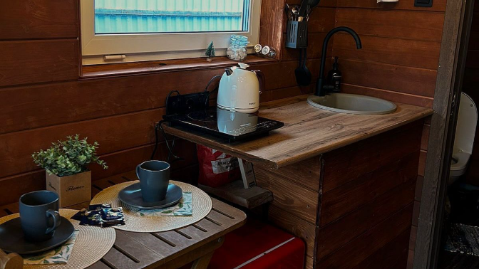 — в доме есть двуспальная кровать, розетки для зарядки телефонов, переносной обеденный стол и стулья;
