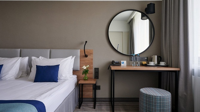 Инфраструктура включает в себя 410 комфортабельных номеров, 17 конференц-залов, фитнес-центр, ресторан, лобби-бар. Проживать вы будете в номере категории комфорт площадью 20 кв. м. Он оформлен в классическом стиле и оснащен телевизором, холодильником, сплит-системой. Предусмотрена ванная комната с гигиеническими принадлежностями. Из окон открывается вид на Ленинградский проспект, Петровский дворец, магистрали или внутренний двор.