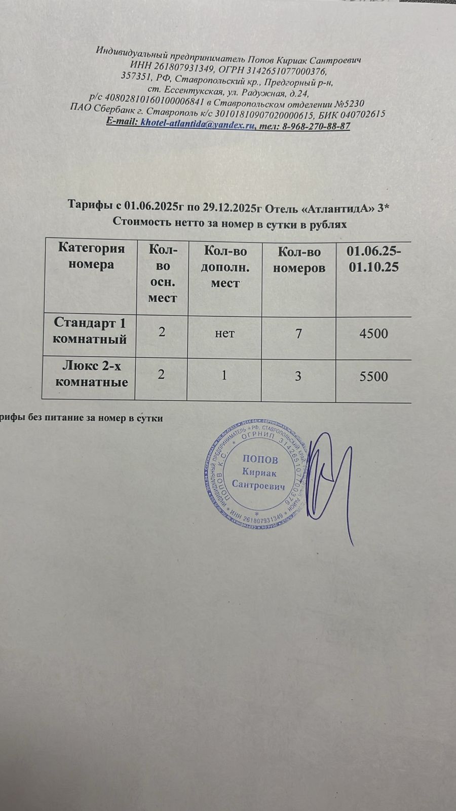- Отель «Атлантида» расположен в центре города. Здесь созданы все условия для комфортабельного размещения. Номера оснащены кроватями, индивидуальной системой кондиционирования, телевизором, собственным санузлом с душевой кабиной.