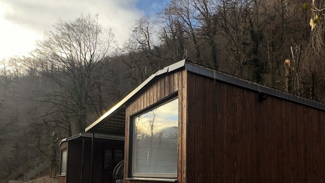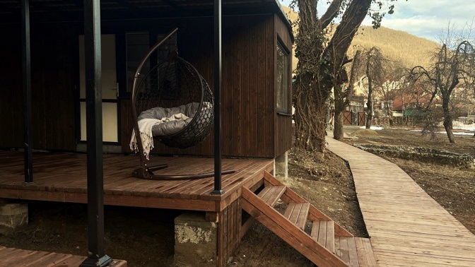 В домике есть все для комфортабельного проживания, также можно будет воспользоваться кухней. А как приятно отдыхать на веранде с качелями, любуясь горами!