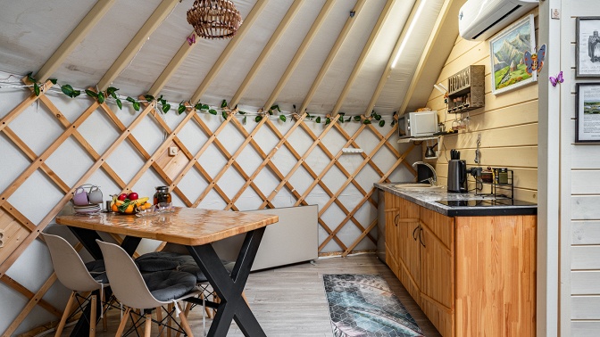 В юрте в современном стиле есть двуспальная кровать (Askona) и раскладной диван (Moon), ванная комната с душевой кабиной и туалетом, фен, полотенца, постельное белье, USB-колонка, Wi-Fi, телевизор, кондиционер. На кухне — холодильник, индукционная варочная панель на 2 конфорки, микроволновая печь, столовый сервиз на 6 персон, фужеры, рюмки и стаканы, кастрюли, сковорода и все необходимое.