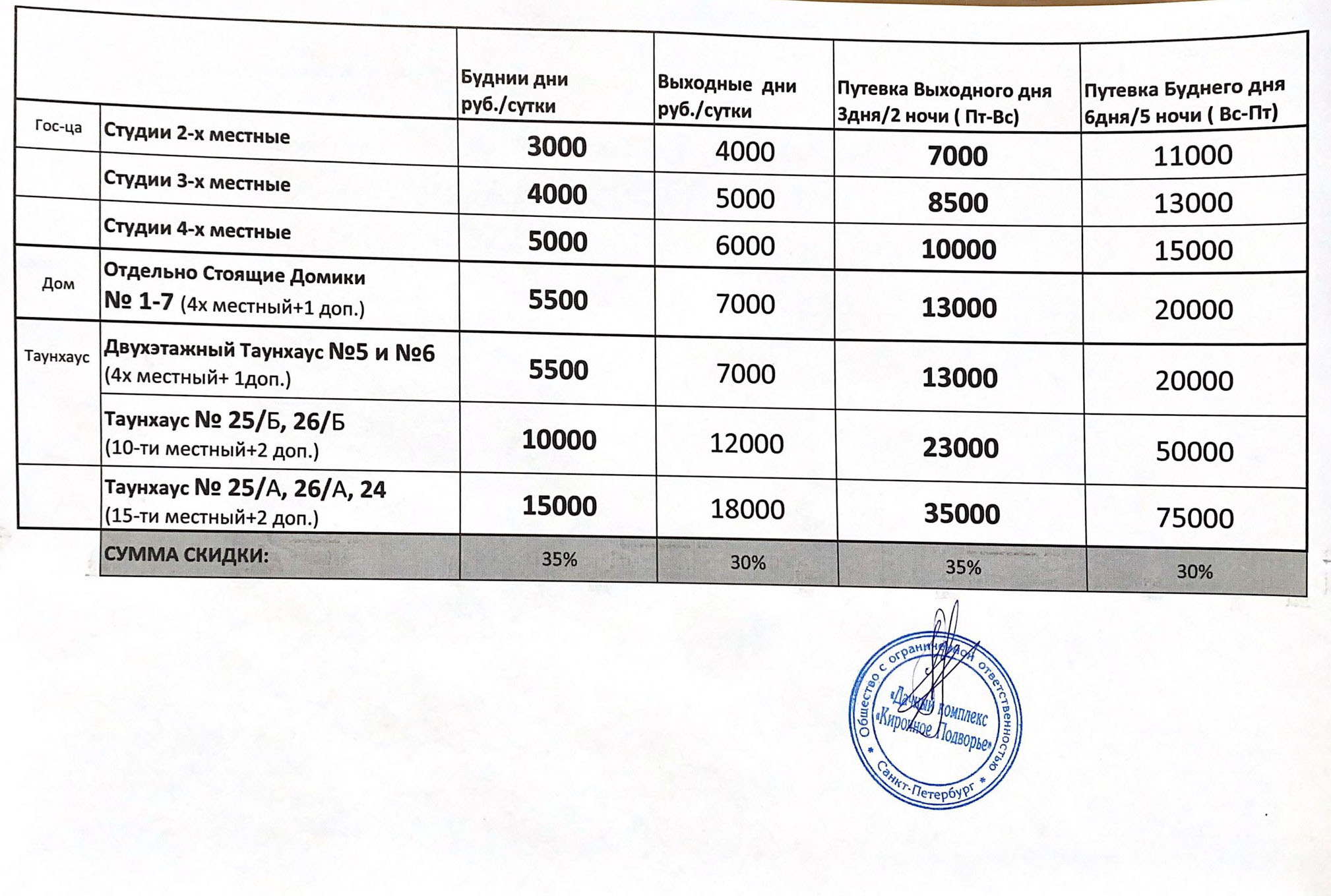 — Скидка 35% на отдых в течение 3 дней/2 ночей в таунхаусе № 25/А, № 26/А или № 24 для компании до 15 человек в выходные дни (пт-вс) (22 750 руб. вместо 35 000 руб.)