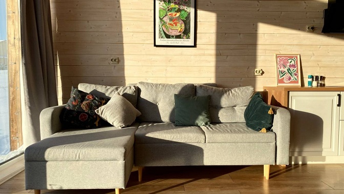— светлая кухня-гостиная (посуда, холодильник, СВЧ, кофемашина/френч-пресс для кофе и т. д.);