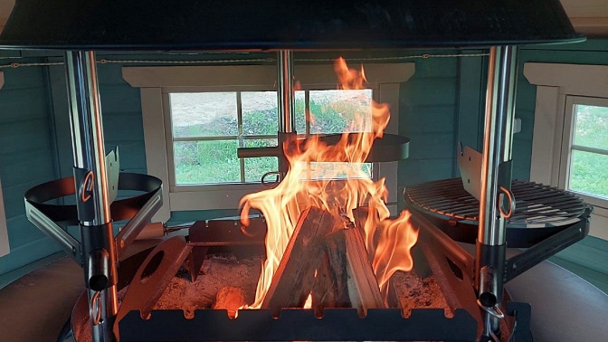 На территории кемпинг-парка есть все для комфортного отдыха. В закрытом финском гриль-домике уютно, тепло и атмосферно даже в прохладную погоду. Также есть костровая зона, мангал и казан, большой обеденный стол, посуда, чайник и мойка. Еще предусмотрена детская игровая зона.
