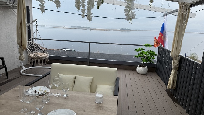 — зона отдыха (терраса с видом на Волгу, на которой есть микроволновая печь, холодильник, посуда, чайник, массажное кресло, банные принадлежности, массажный стол, колонка и караоке);