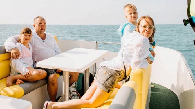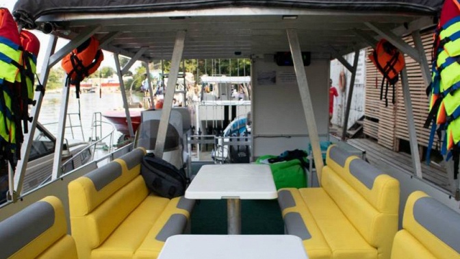 На двухпалубном тримаране «Посейдон» созданы все условия для комфортного отдыха и веселого времяпрепровождения. Здесь есть удобные кресла и столы, спасательные жилеты и санузел, уютная аэрария с мягкими пуфами, где можно расслабиться, любуясь бескрайними просторами моря.